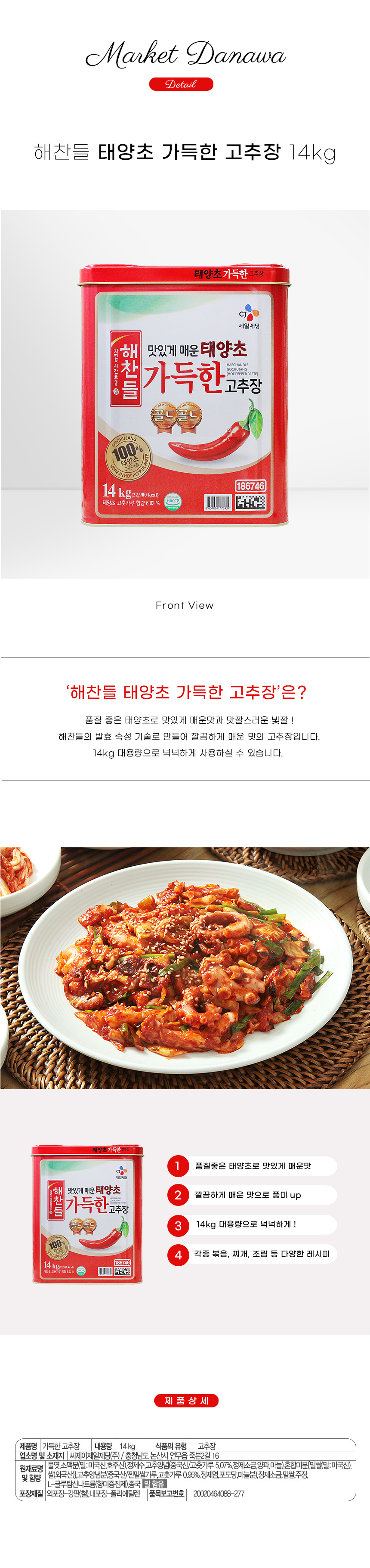 해찬들 맛있게 매운 태양초 가득한 고추장 14kg 골드